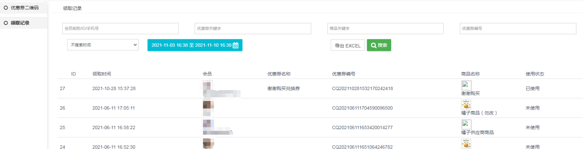 可以看到会员领取时间和使用记录,可以按优惠券关键字,商品关键字,优惠编号等条件来筛选查看
