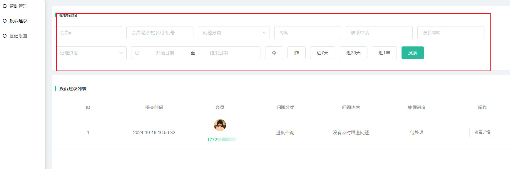 支持筛选会员ID,昵称,姓名手机号,问题分类,内容,联系电话/邮箱,处理进度,时间等信息
