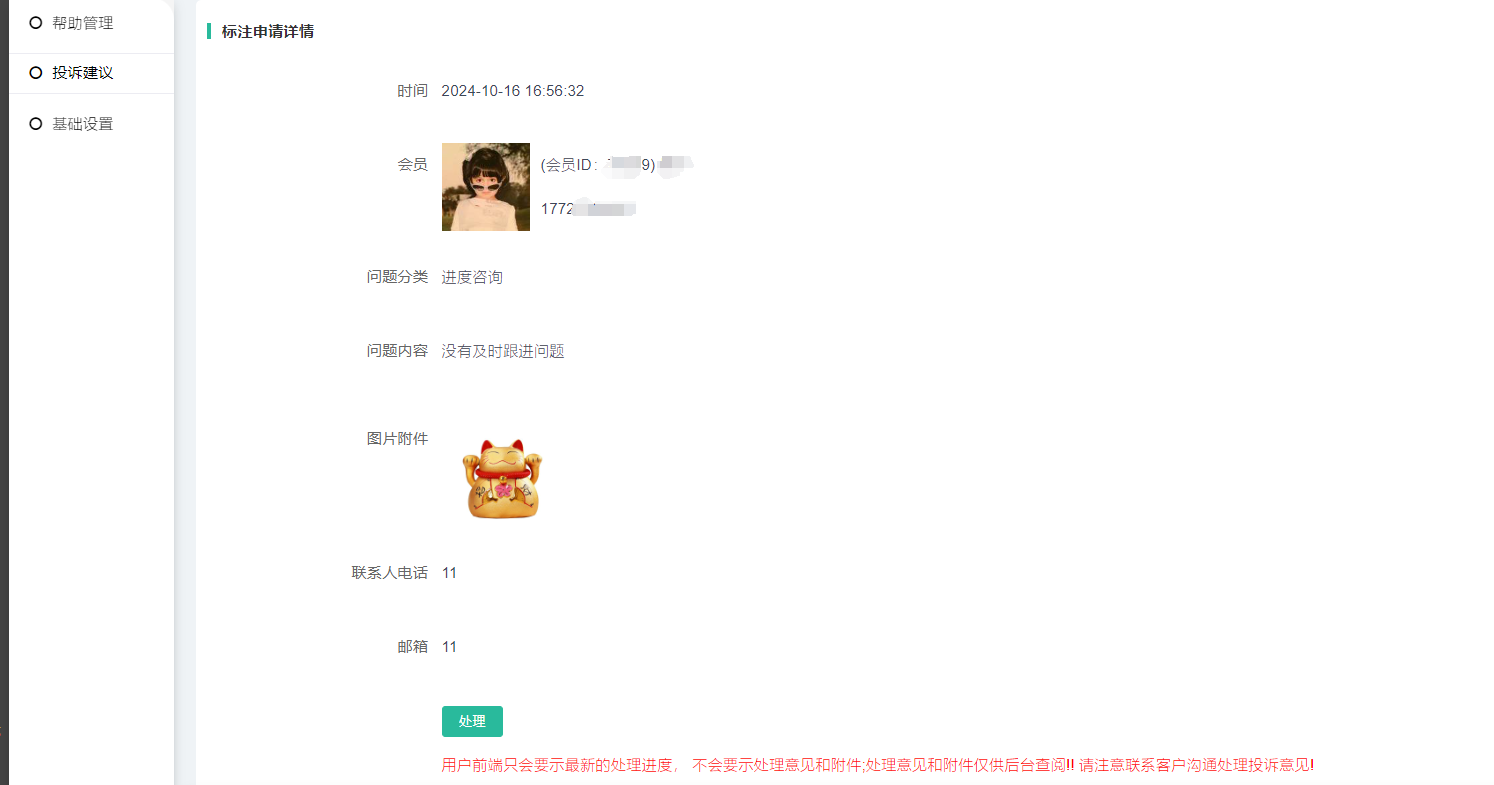 注意用户前端只会要示最新的处理进度, 不会要示处理意见和附件;处理意见和附件仅供后台查阅!! 请注意联系客户沟通处理投诉意见!