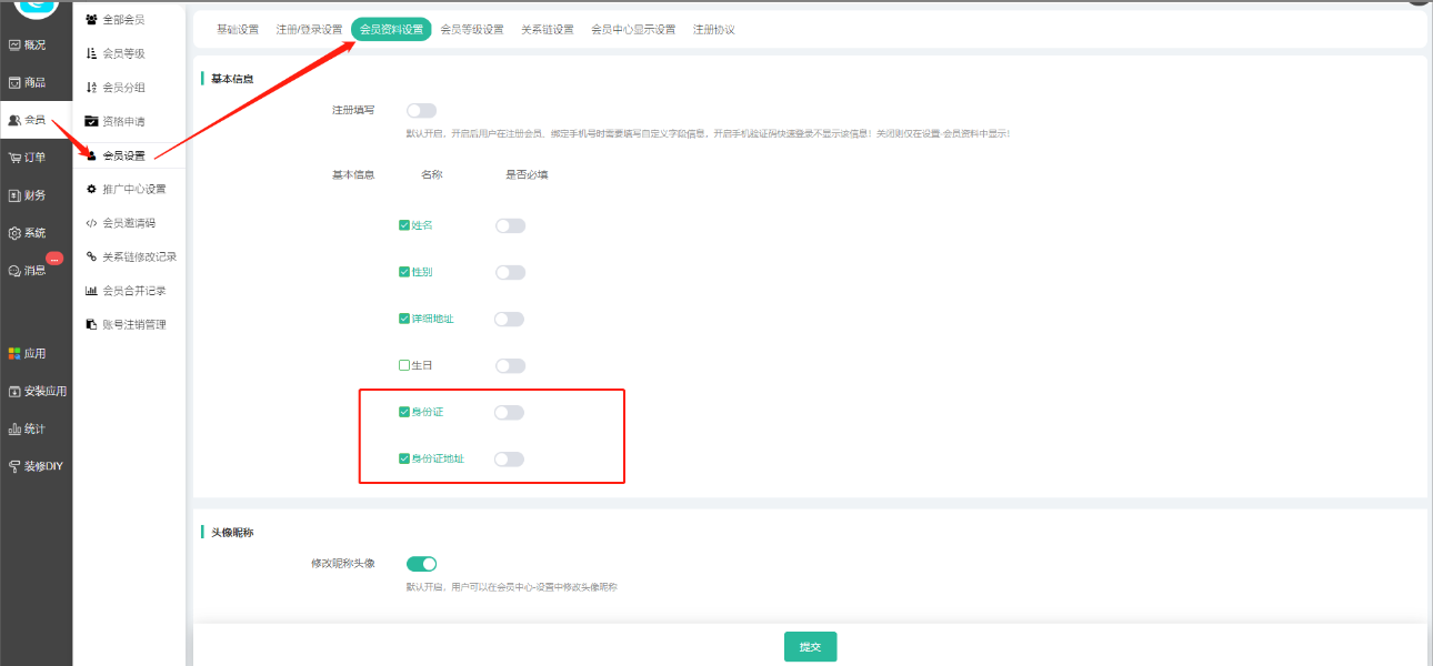 商城后台-会员设置-会员资料设置 新增填写身份证、身份证地址(目前地址项签约非必填)。