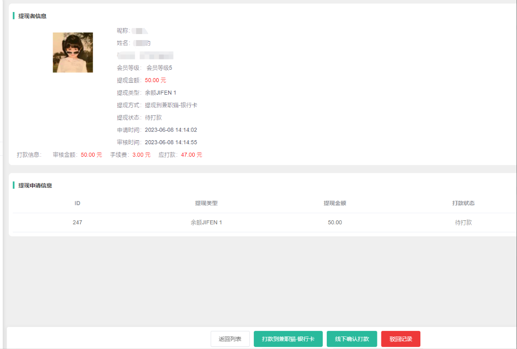 3. 打款列表:记录会员打款信息