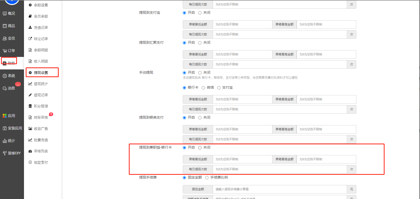 5. 财务—提现设置——财务提现/收入提现设置:新增兼职猫提现开关