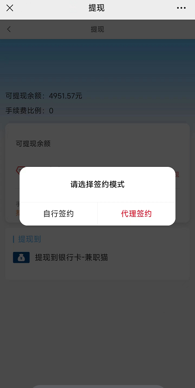 用户(仅支持年龄范围18-60)前端发起提现到银行卡-兼职猫的申请时自动签约。第一次使用兼职猫提现功能时个人信息不完整,则会出现需要完善个人资料的提示。若个人资料无误,后台审核通过后,由兼职猫打款给客户。