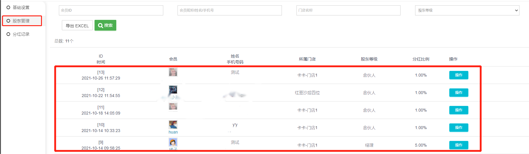③在该列表可查看到股东的id、成为时间、股东会员信息、股东等级、分红比例