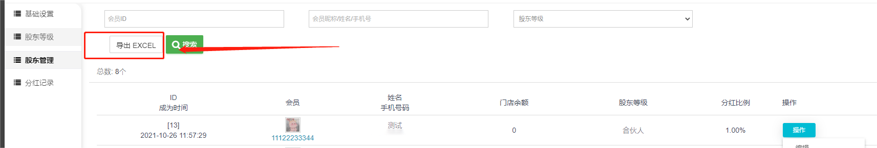 可按门店、奖励时间筛选对应的门店股东分红,可导出excel