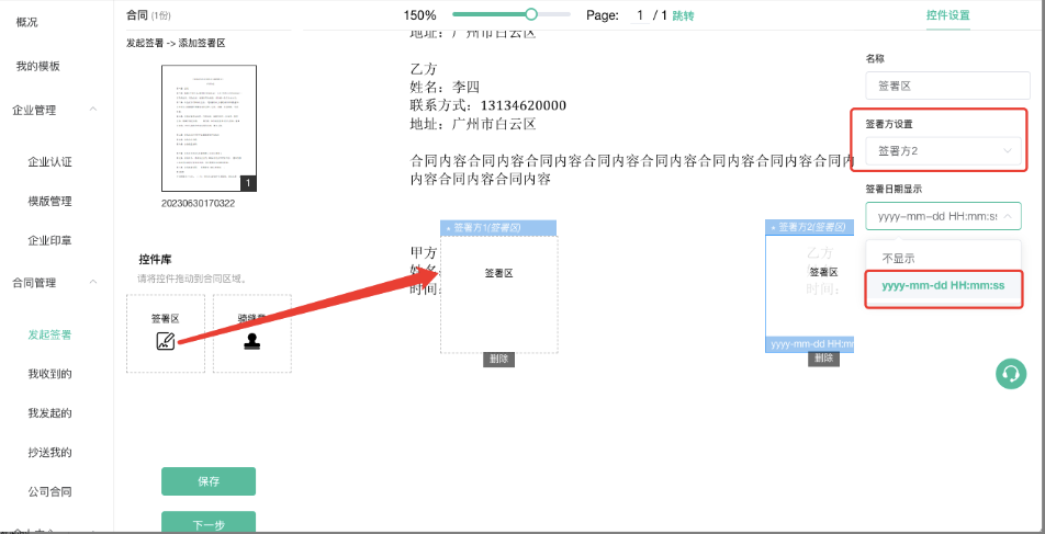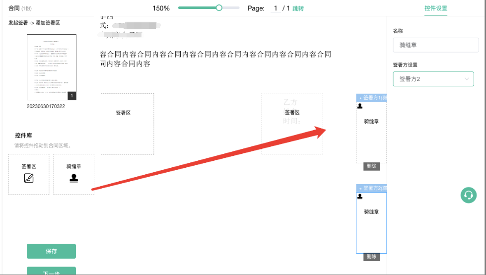 点击长按签署区控件,拖动到合同相应的签署区域。