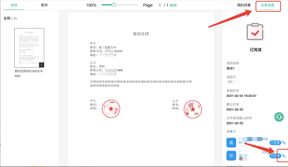 也可以复制签署链接发送给对方,链接位置在合同页右上角的【任务信息】,往下拉找到签署方,在姓名后面有一个链接符号,点击即可复制。
