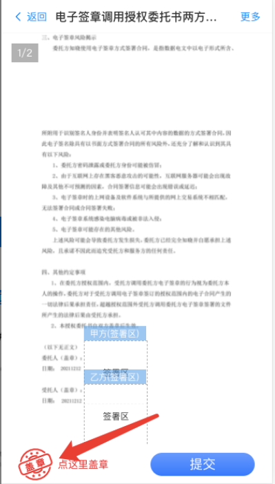 文本内容填写完毕后点击签署,进入签署页面,点击左下角“盖章”;