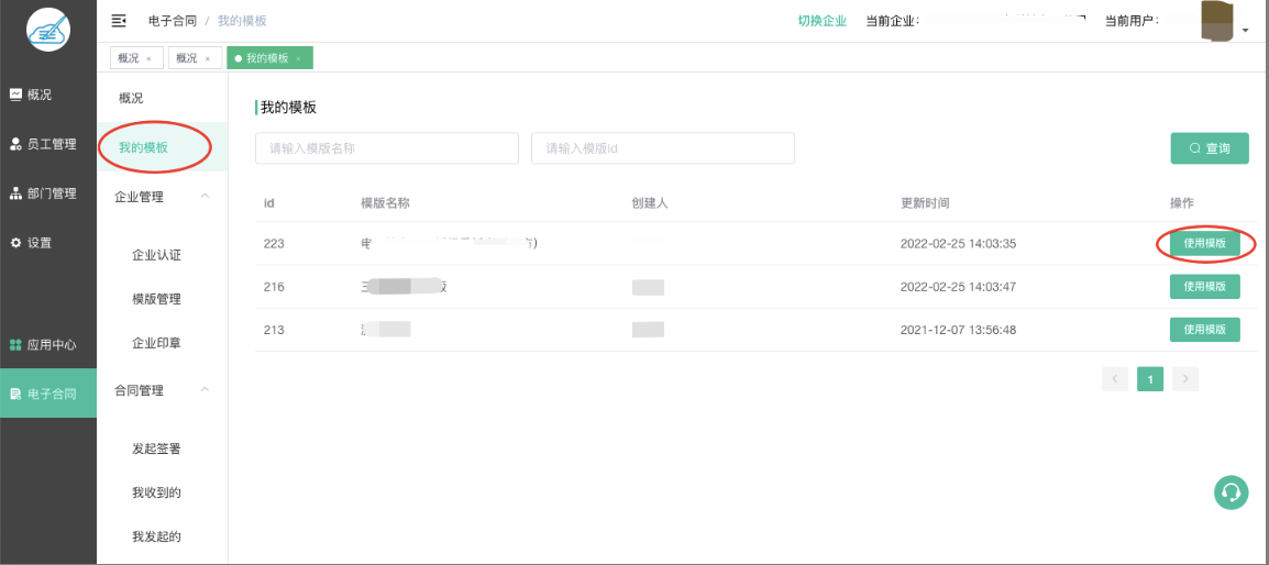 2、员工账号如果没有显示合同模版,则表示法人没有授权员工模版,需要登录电脑端操作授权;
