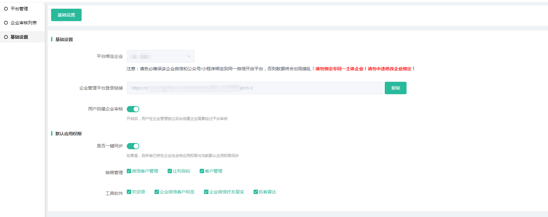 - 登录链接:企业管理PC端登录入口链接,您可以复制链接在浏览器地址栏访问,或者将链接设置到后台首页等位置,便于用户点击跳转登录;