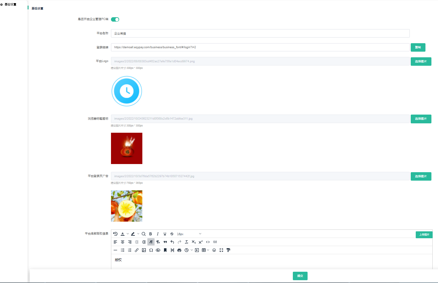 - 平台底部版权信息:企业管理PC端底部显示的版权信息,可自定义设置,如平台名称、地址、备案号等。