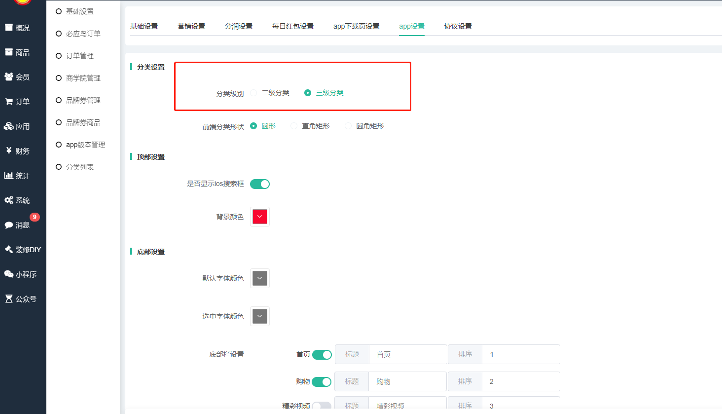(1)首先,需要在基础设置--分类设置中选择分类级别
