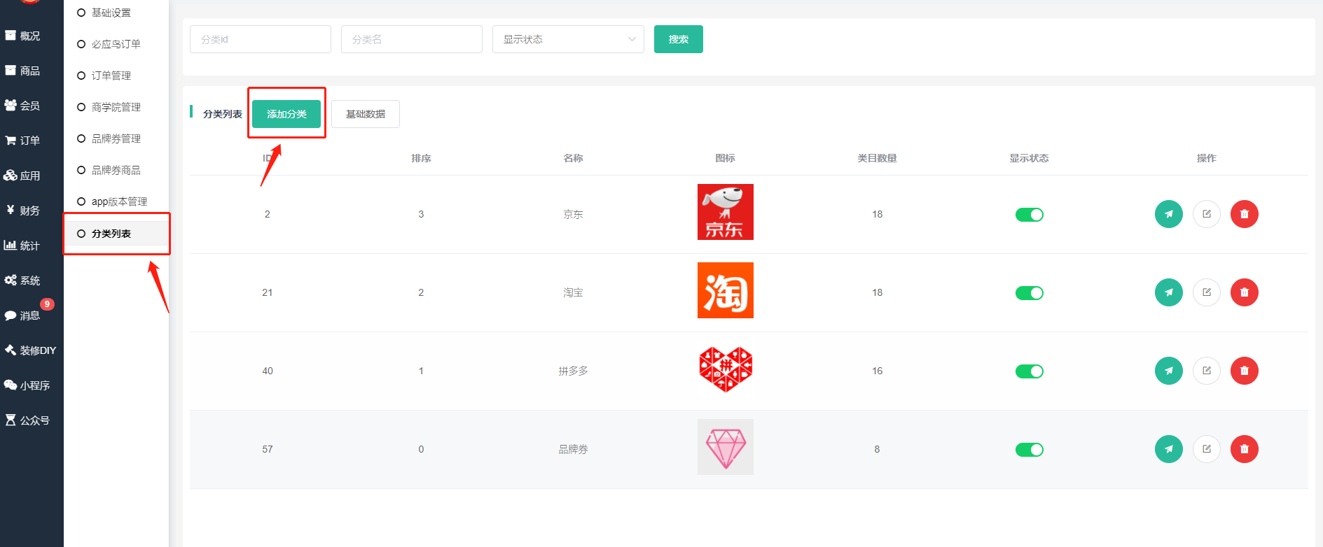 淘宝、京东、拼多多三种分类类型的设置一致。