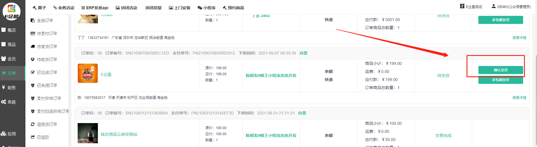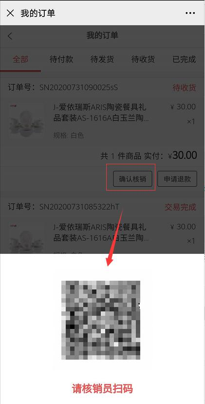2)会员下单可选择普通快递还是到店自提。若选择自提,需填写提货人姓名、手机等。平台发货后,订单详情处会显示确认核销的按钮,会员到店自提出示核销二维码让核销员微信扫码,订单就核销完成,会员可提货离店。