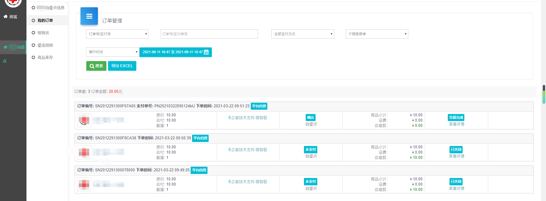 自提点信息-我的订单-核销员-提成明细-商品库存
