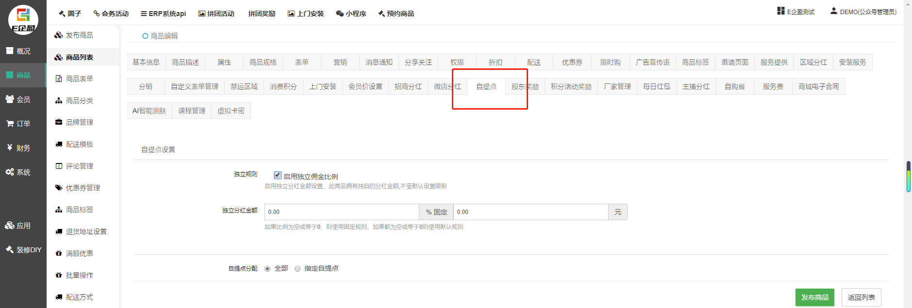 路径:商品列表--编辑商品--配送--可选配送方式:快递or自提。注:可勾选其中一项,若都不勾选,保存后默认都勾选。商品须为实物商品,且填写地址。虚拟商品不支持自提,因一付款订单就直接完成收货,跳过发货收货步骤。