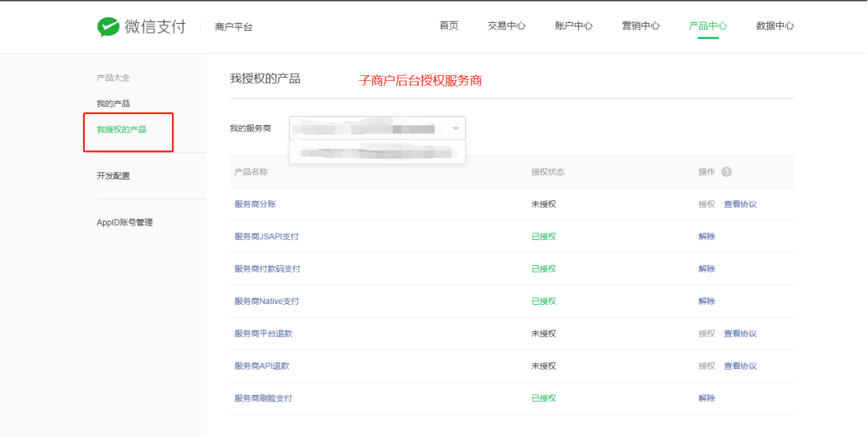 四、申请下来后,登录子商户后台,网址还是一样的pay.weixin.qq.com。子商户后台--产品中心--我授权的产品--选择关联的服务商。