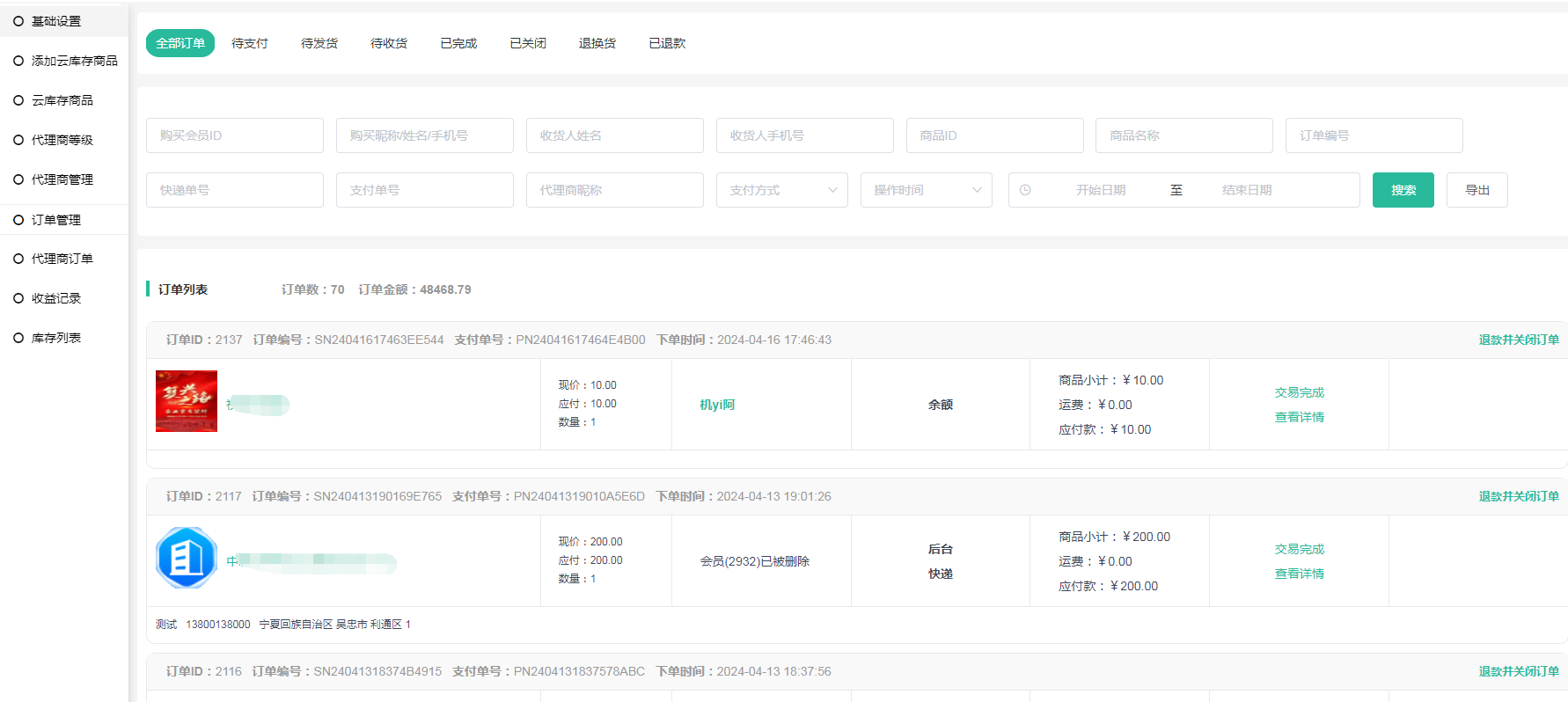 代理商订单:代理商在前端进货的订单信息,订单支付后完成(不需要发货)
