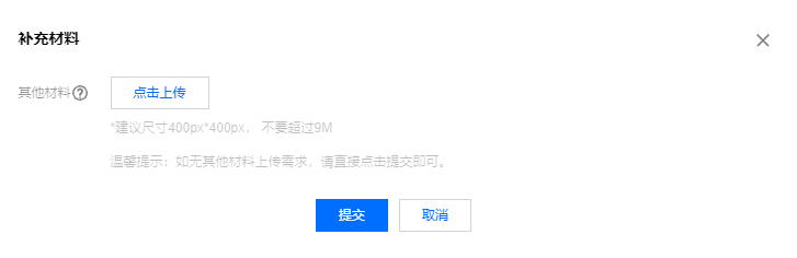 5.单击下一步,在弹出的 “补充材料” 窗口中,上传您本次备案所需的其他备案材料。例如承诺书等。如下图所示: