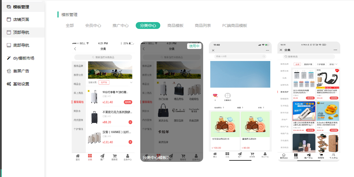 可在装修--模板管理--分类中心选择前端显示的模板:
