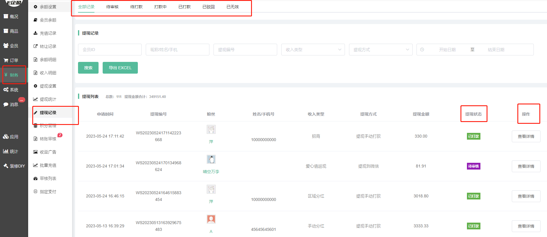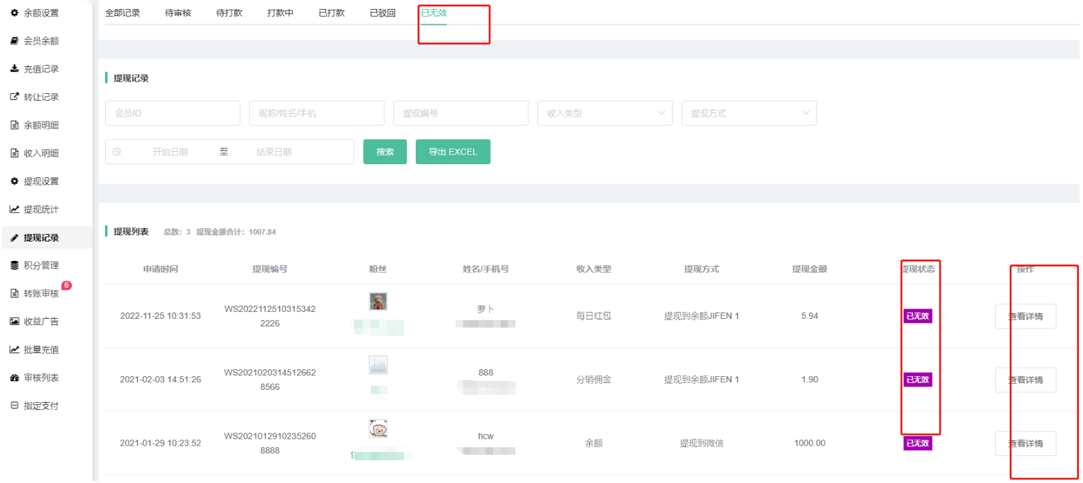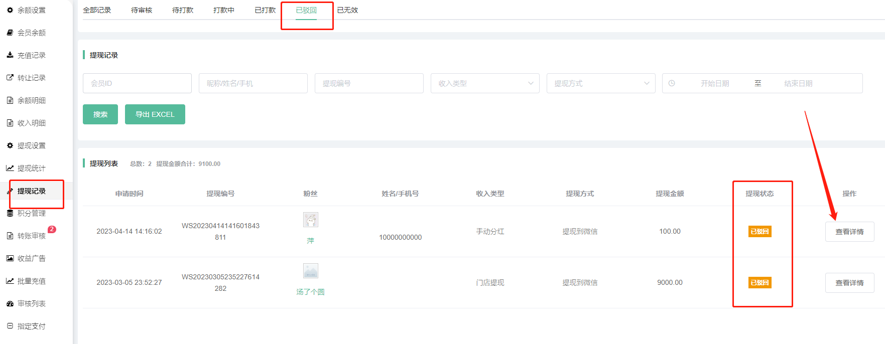 6)已驳回:审核操作驳回的提现记录统计列示。