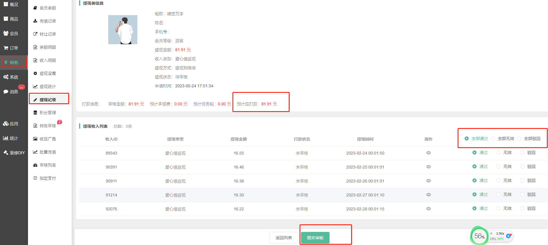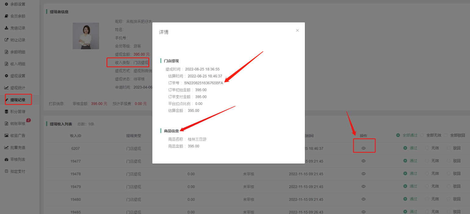2)待审核:会员提交的未处理的提现申请,则在“待审核”中进行统计列示,点击详情,可查看提现者信息和提现的申请信息,以及对提现进行审核。可审核提现通过、无效或驳回,若申请提现信息有误,商家可选择“驳回”或“无效”。