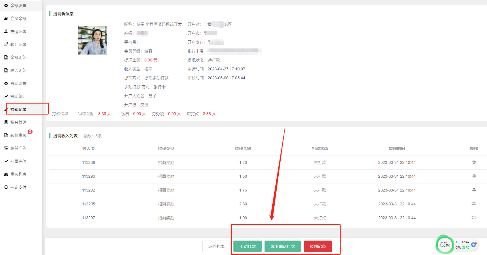 4)打款中:已打款,但还没到账的提现记录统计列示。