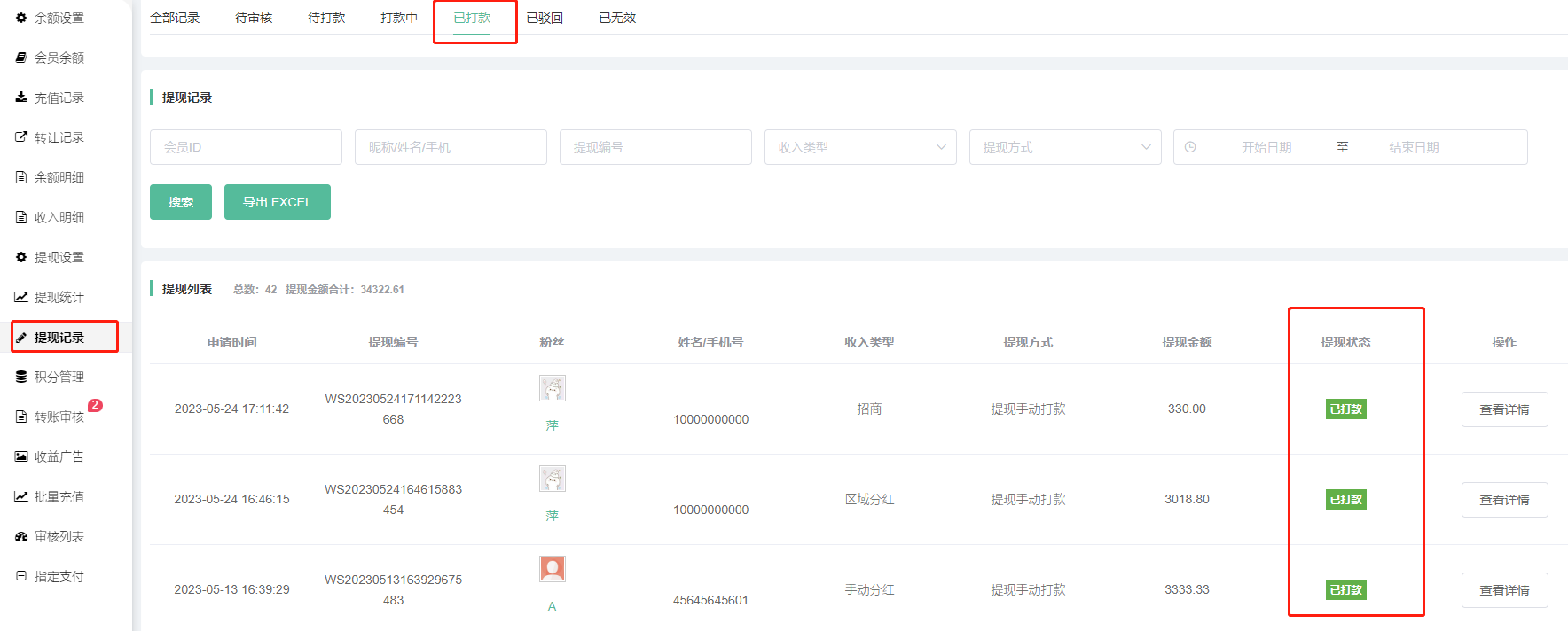 5)已打款:已完成审核,并打款到账的提现记录统计列示,可以点击查看详情;