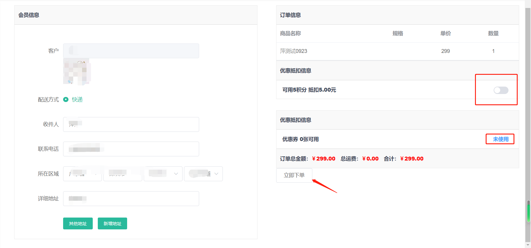 填写收货人地址信息,如果该会员之前下过单,或者有设置过默认地址,会自动填充默认地址,若没有自动填充,则需要手动输入地址(若需要修改地址也可点击新增地址进行修改),填写完之后点击立即下单,提交订单,支持商品规格选择,支持使用优惠及积分抵扣机制,代客下单只显示三种支付:货到付款、余额支付、确认支付(金额为0才显示) 如下图: