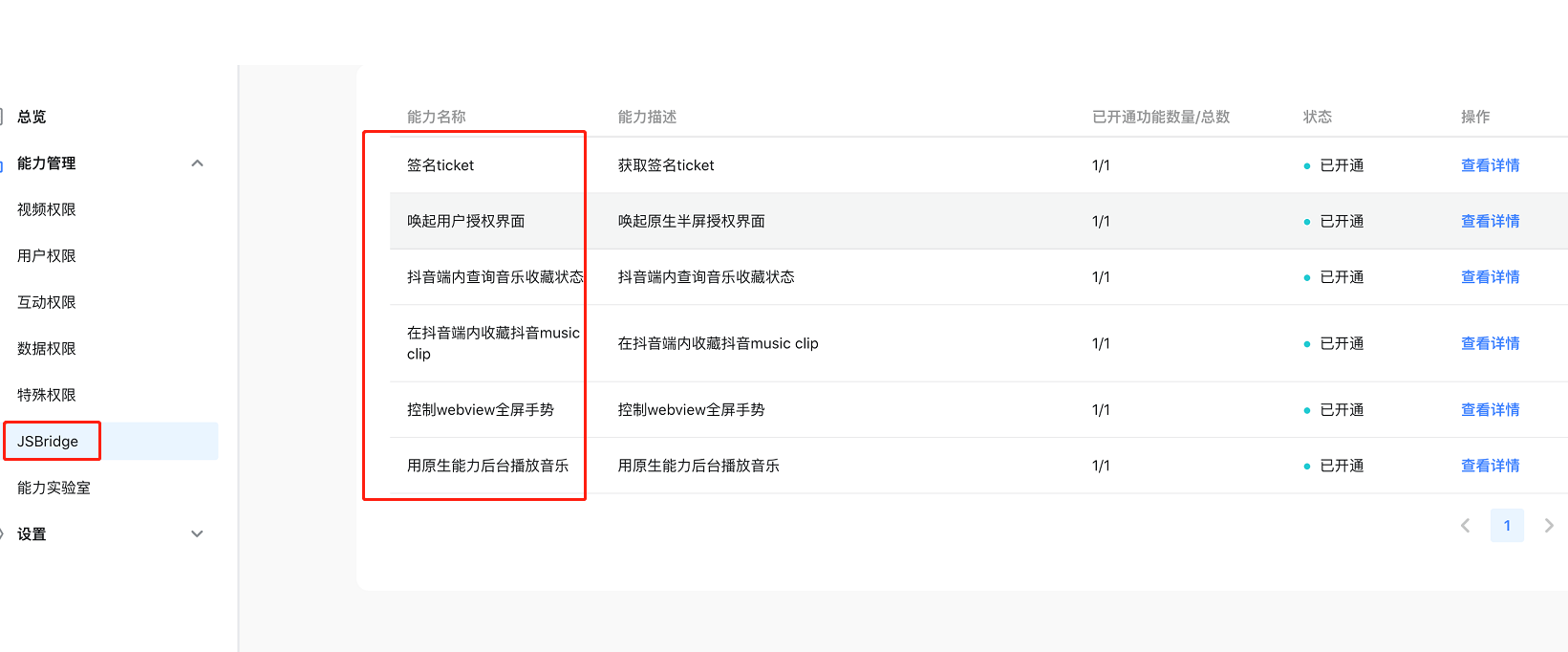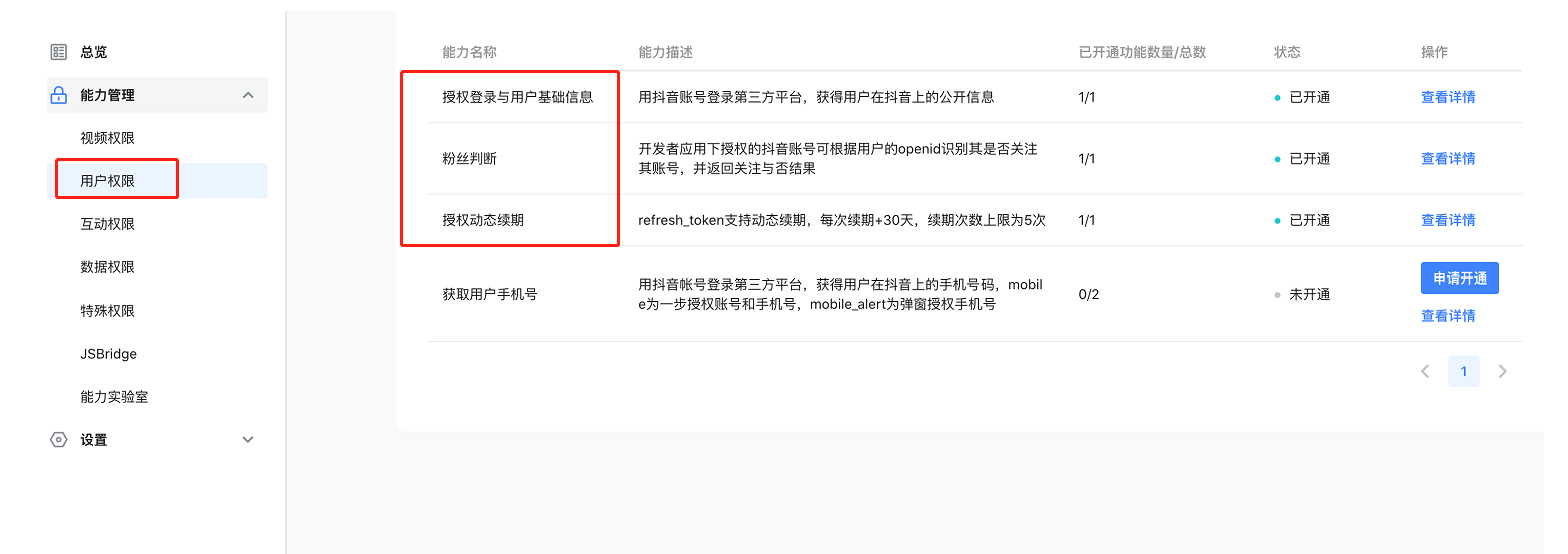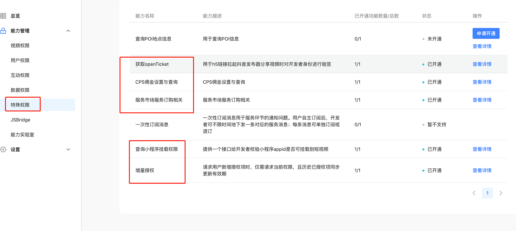 (需要用什么就对应开通即可,没有使用到的可以不用开通,比如视频分享页面需分享到抖音的,那么视频权限就需要开通)