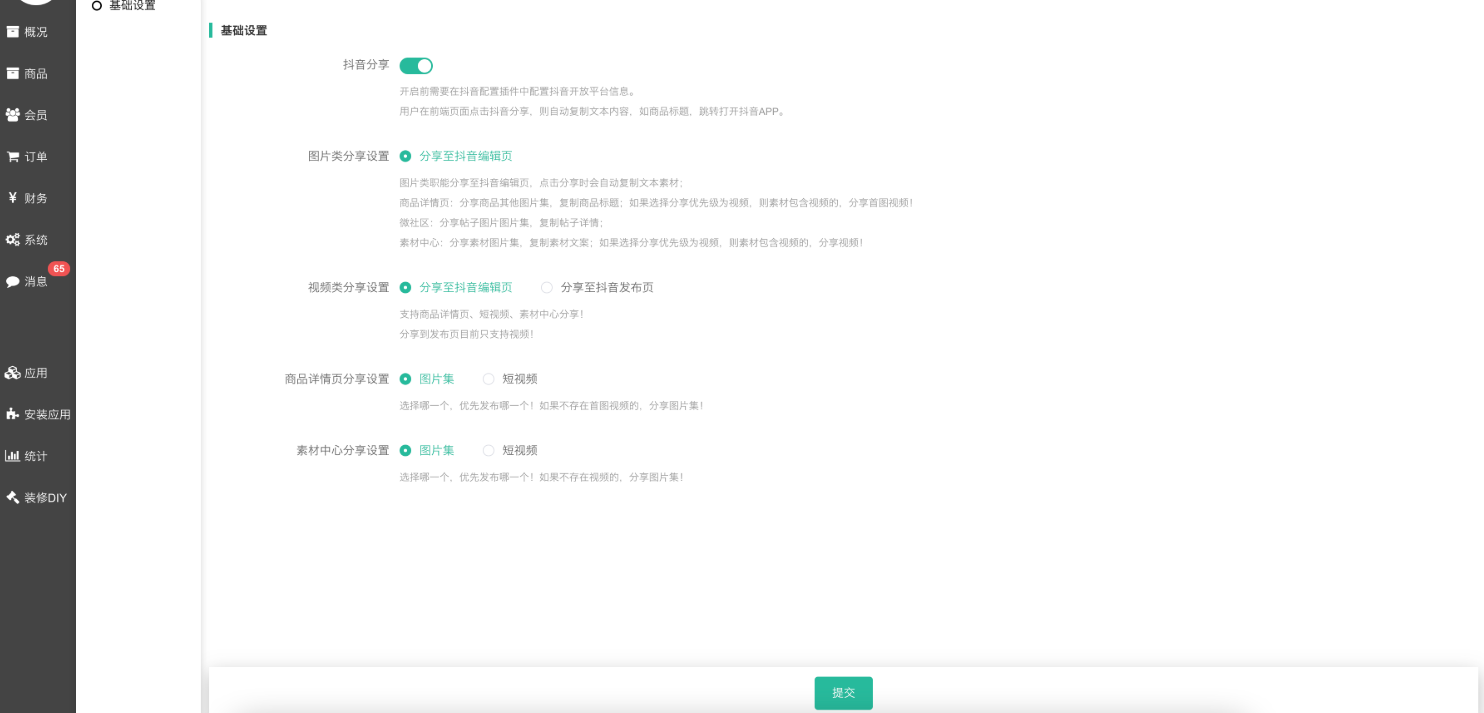 支持将商城的商品、短视频、素材中心三个板块的图片、视频素材一键分享到抖音;