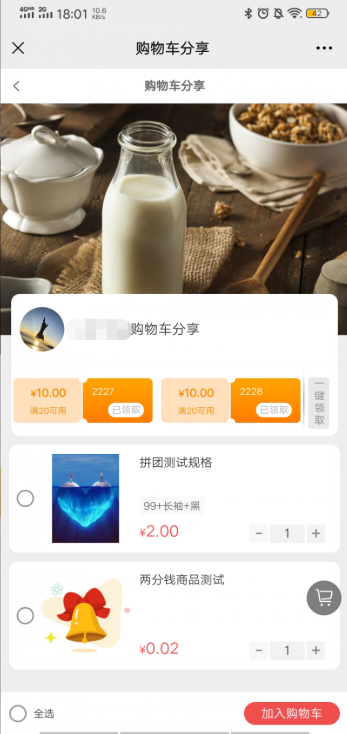 会员A选择购物车商品生成推荐清单,转发给会员B,会员B进入清单页面,可一键领取优惠券,并从中选择喜欢的商品加入自己的购物车。支持H5+小程序端。