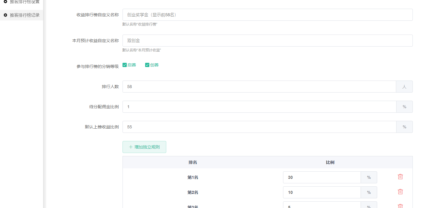 上榜的会员获得的收益比例。可以设置独立规则,第1名 第2名 第3名 第4名....(可自由增加)