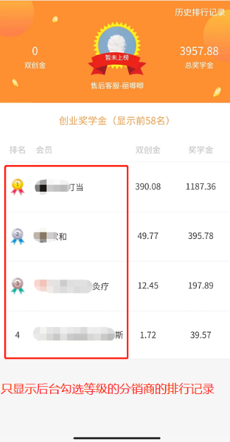 参与排行的等级里,限制排行的人数。如设置10人,前端显示收益排行前10名的金牌等级分销商
