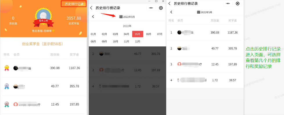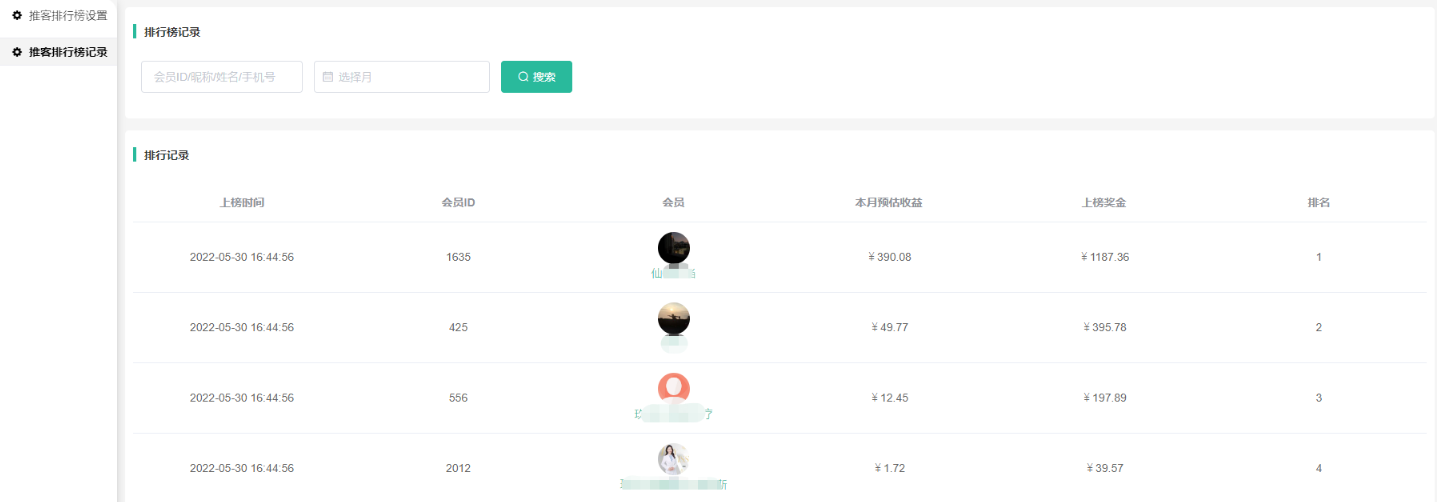 显示上榜会员的收益记录信息,可根据会员ID、昵称、姓名、手机号,选择时间搜索相应的记录