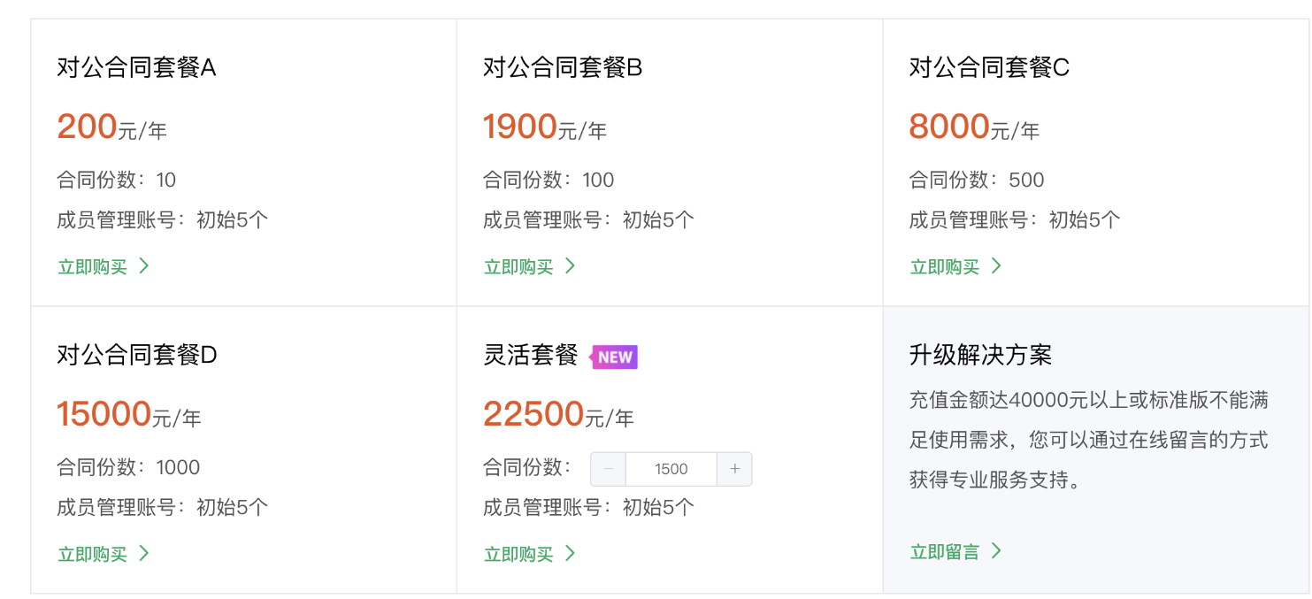 电子合同A套餐:包含300份电子合同,有效期1年,售价1500元;