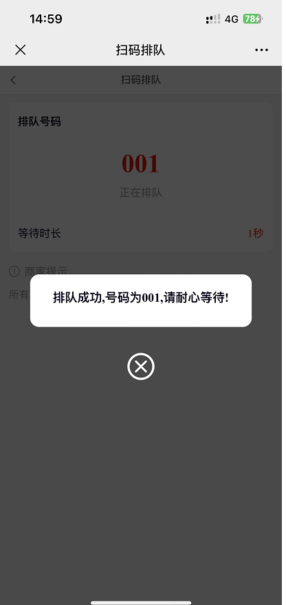 1)前端会员扫码成功排队后弹出的提示,提示语格式:排队成功,号码为xxx+设置的内容