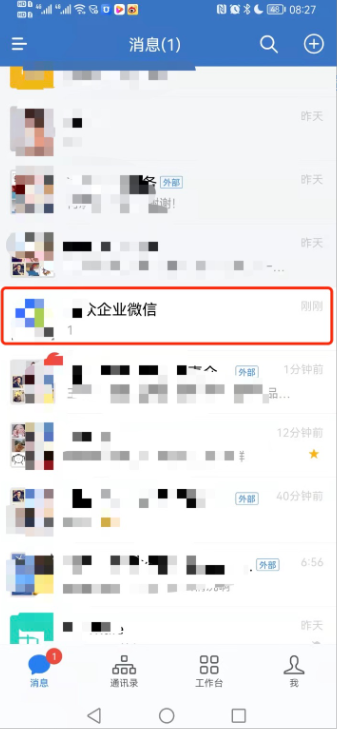 企业微信会话列表应用提示新客服消息:进入后显示咨询提醒,点击即可跳转到客服手机端