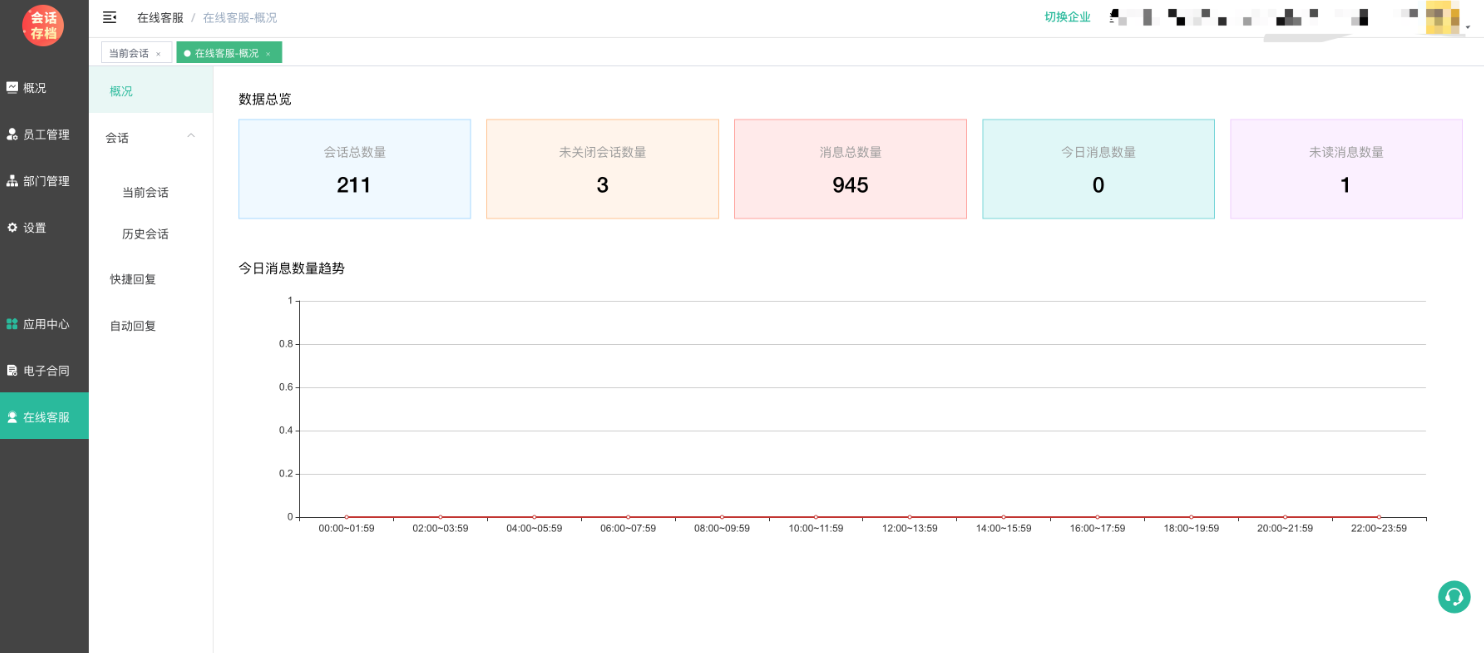 在线客服 客服端只能通过企业管理PC端进行访问,客服人员登录进入在线客服 客服端应用,首先进入的就是概况页面。概况页面显示客服咨询的数据总览、今日消息数量趋势等信息。如下图:
