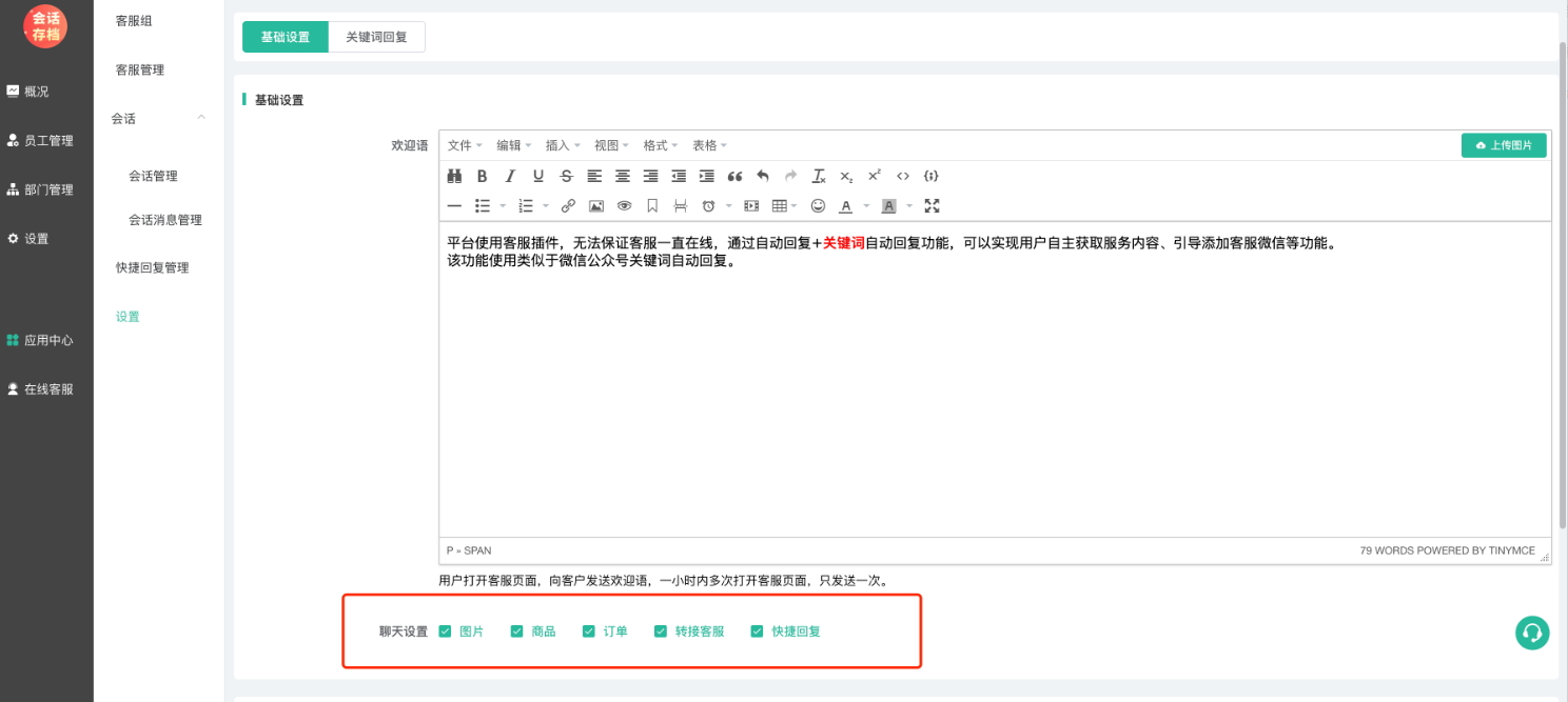 支持编辑器图文设置,设置后,用户在前端发起客服咨询,自动回复欢迎语。