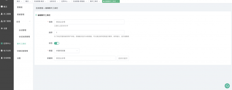 工具栏支持设置对应的回复关键词,点击自动获取关键词回复内容;