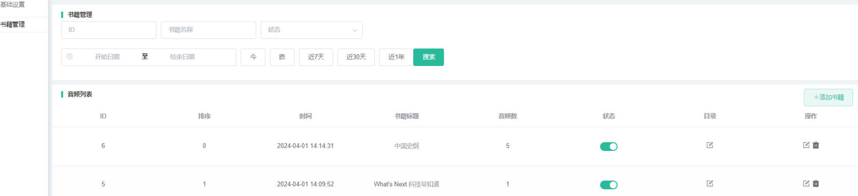 1、显示书籍的ID、排序、时间、书籍标题、音频数、状态、目录(点击目录可跳转到音频列表)