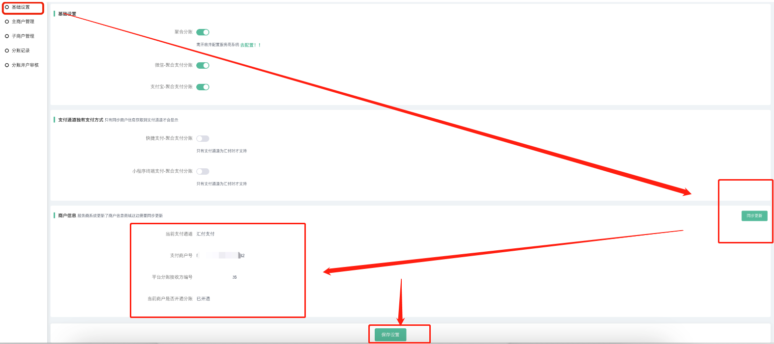 1、开启分账支付方式,点击同步更新商户,提交保存。