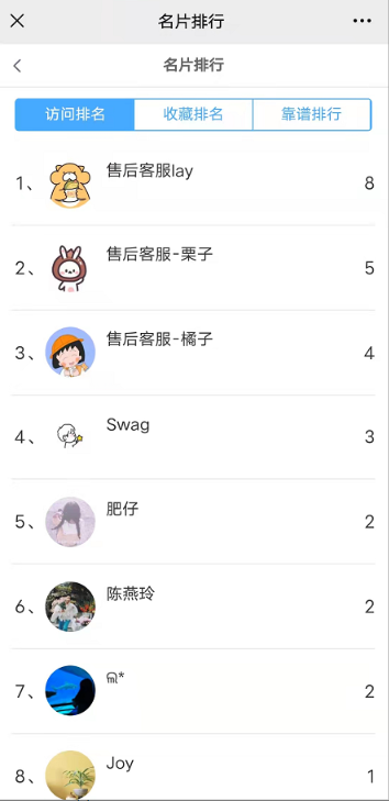 2,访问次数为用户访问你的名片的次数,刷新一下也会增加一次;收藏次数为用户收藏你的名片的次数;靠谱次数为点赞次数