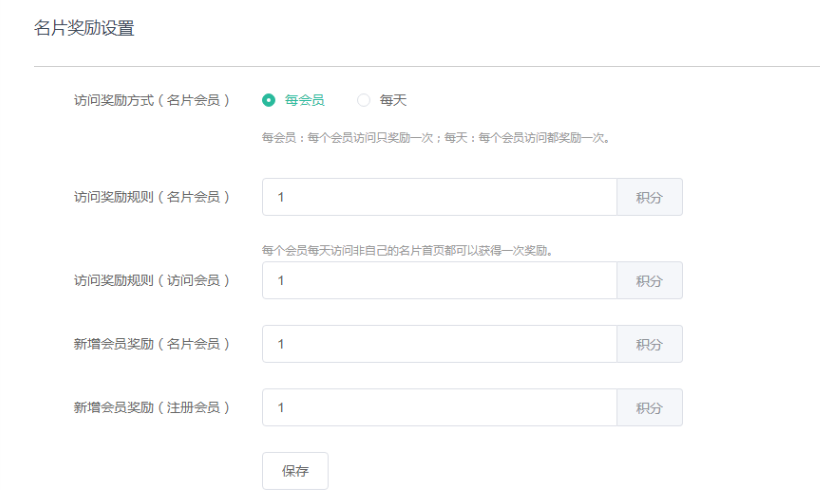1)访问奖励方式(名片会员):每会员(名片每被会员访问,名片会员即可获得一次奖励,即不管一个会员访问多少次用户名片,用户只能通过该会员获得一次奖励)、每天(同一个用户明天访问用户名片,用户都可以获得奖励)